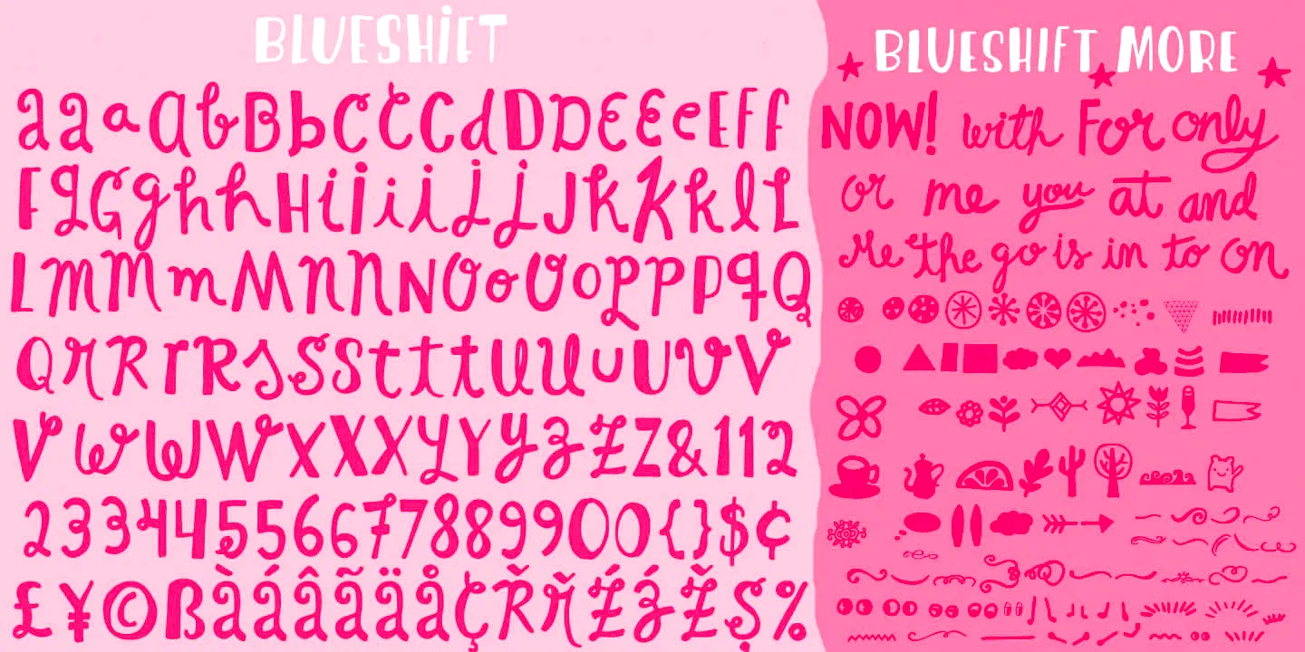 Blueshift is a playfully hand-drawn font family. Featuring an expressive script, an all-caps sans serif, and a set of decorations, all with a lively rhythm and a friendly tone. They all play together devilishly well or use them separately, too! Perfect for children’s books, journals, invitations, and packaging calling for a lighthearted and human touch.