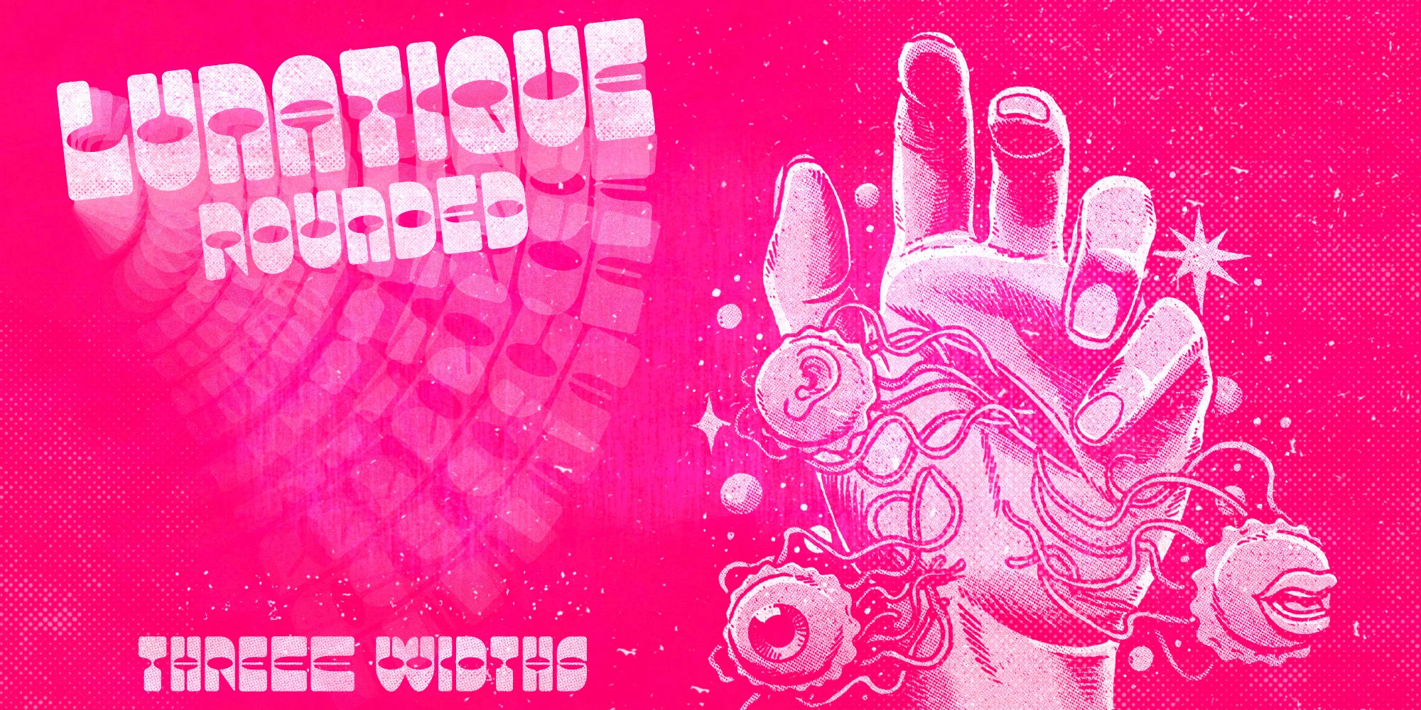 Lunatique Rounded — a softer version of Lunatique — is a highly decorative typeface inspired by the Lucky typeface, designed in 1972 by André Pless for the Mecanorma Permanent Type Contest. The style was later released as Letterpress transfer sheets. These digital versions will be way easier to use. Lunatique is available in three widths, with a few alternates, too. Well-suited for packaging, album covers, posters, book jackets, and anything that calls for vintage charm with a modern edge.