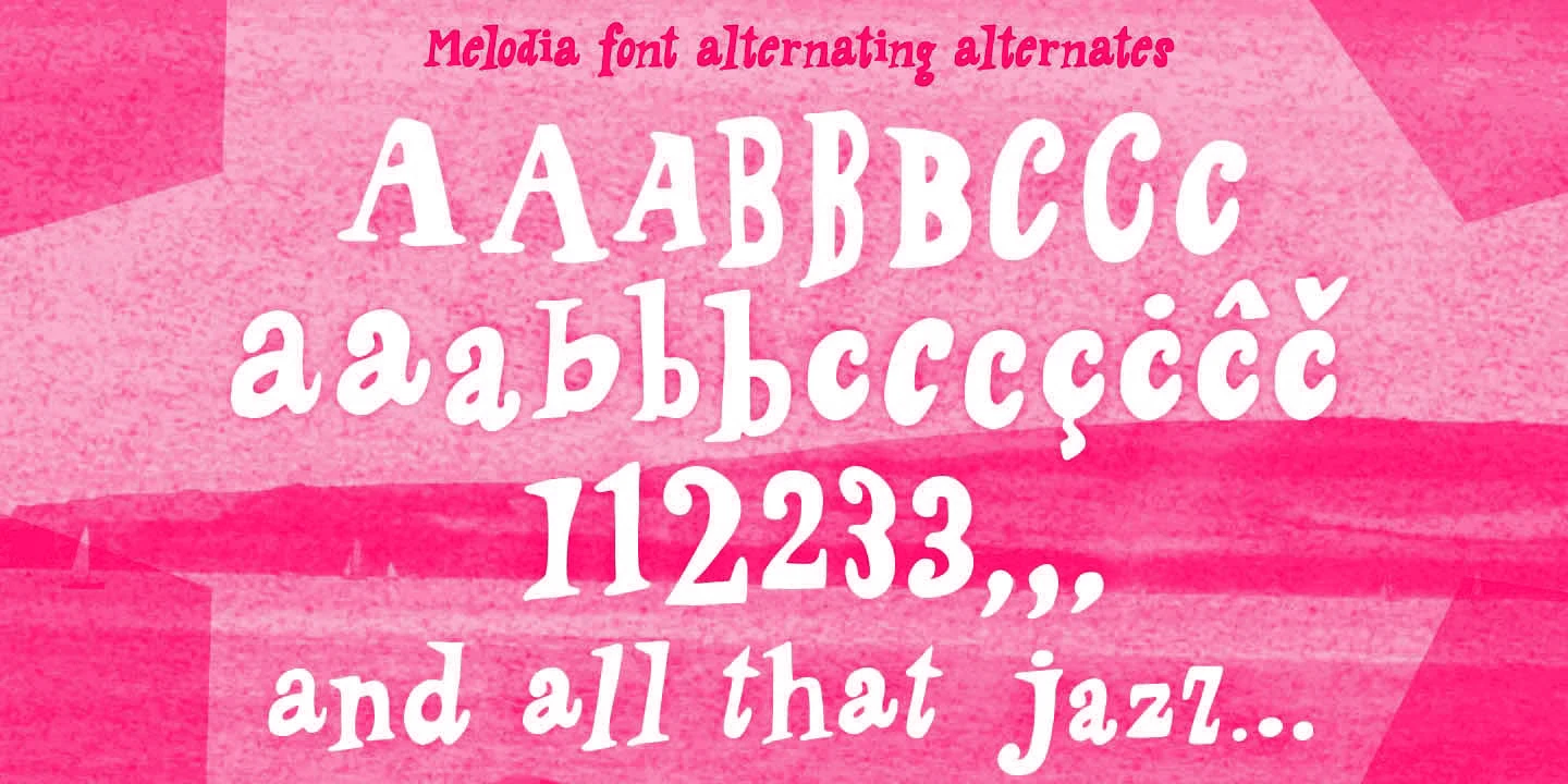Melodia is a highly energetic hand-lettered serif. It’s a whimsical font with a lot of flair and musical rhythm. Quirky curves and a bouncing baseline bring a lively, spontaneous tone, particularly when alternates are used. Ideal for creative projects calling for personality — think children’s books, theater posters, expressive packaging, or spirited editorial design. Melodia strikes a balance between playful elegance and typographic improvisation. Remember! Use it only on cool stuff.