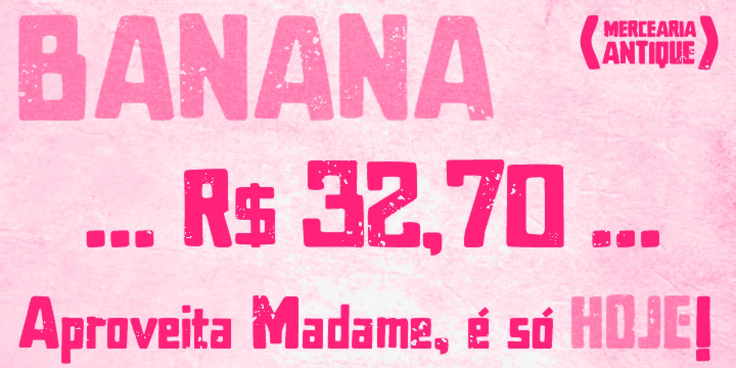 Mercearia Antique is an inky, blocky, hand-lettered font based on a 1944 Brazilian book about alphabets and lettering styles. It channels the spirit of hand-crafted typography. Combining squarish letterforms with soft edges gives designers a typeface suited for projects needing a hand-finished feel. With its mix of charm and craft, it works really well on posters, packaging, branding, and signage, where character and clarity are equally important. Mercearia works like a charm in display sizes!