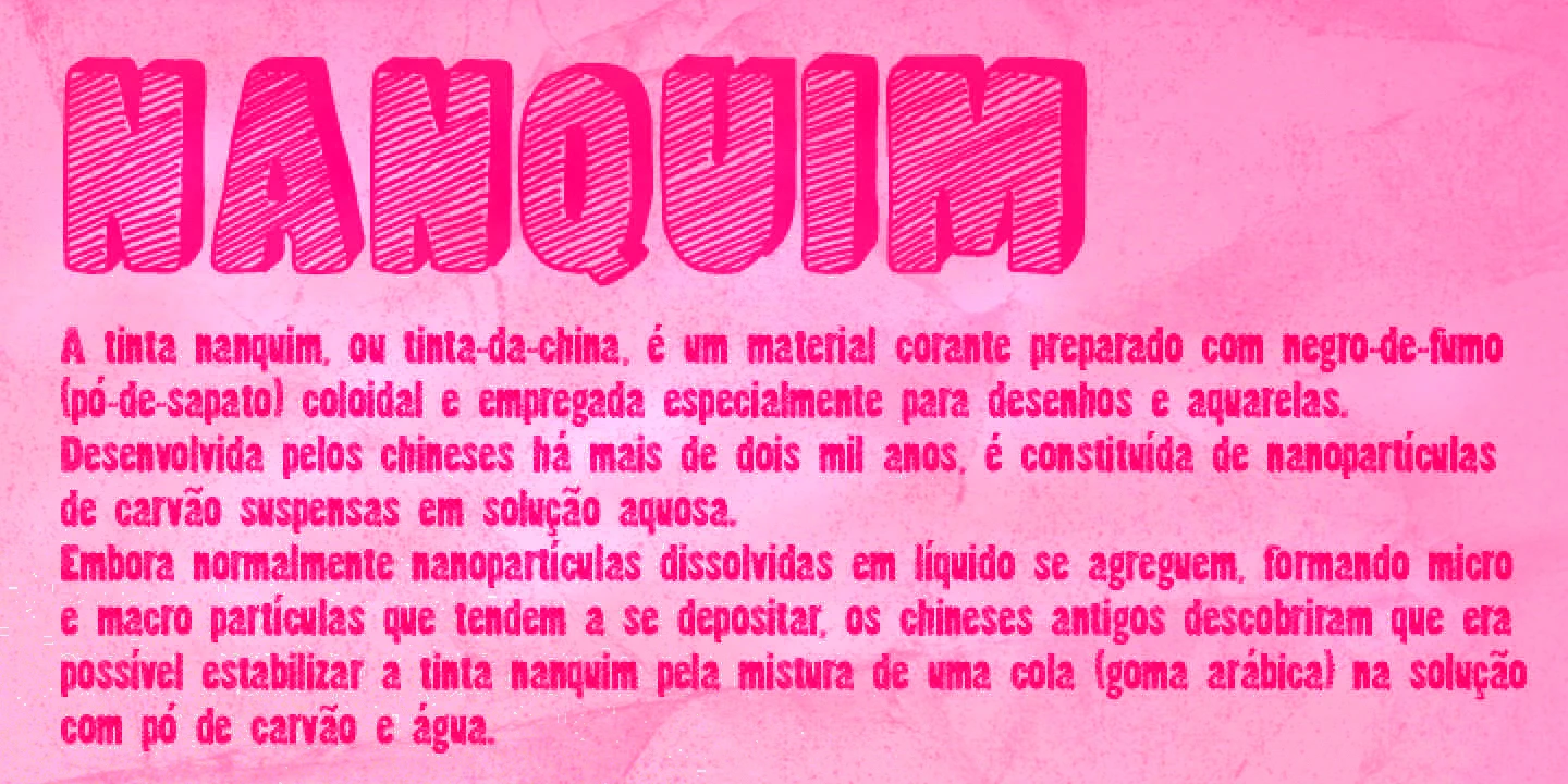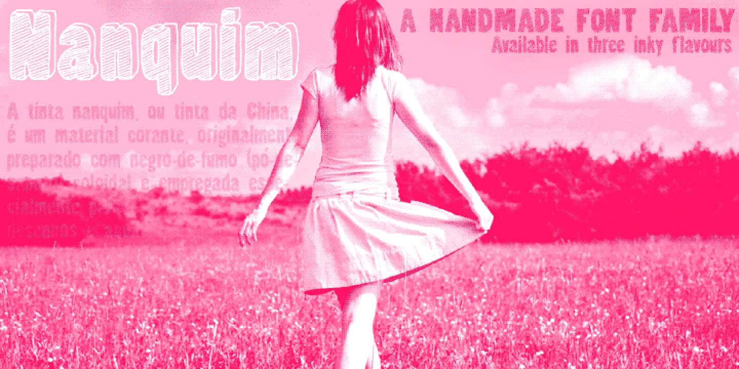 Nanquim is a textured, high-impact type family with a vivid hand-drawn look. Its bold shapes are filled with intricate strokes, crosshatching, and irregular outlines — capturing the feel of ink on paper. Whether used in large or small quantities, it conveys texture and movement, always with that pleasant, handmade feel. Its expressive, inky character makes it ideal for book covers, posters, magazines, and packaging where a loud voice and handmade aesthetic are key.