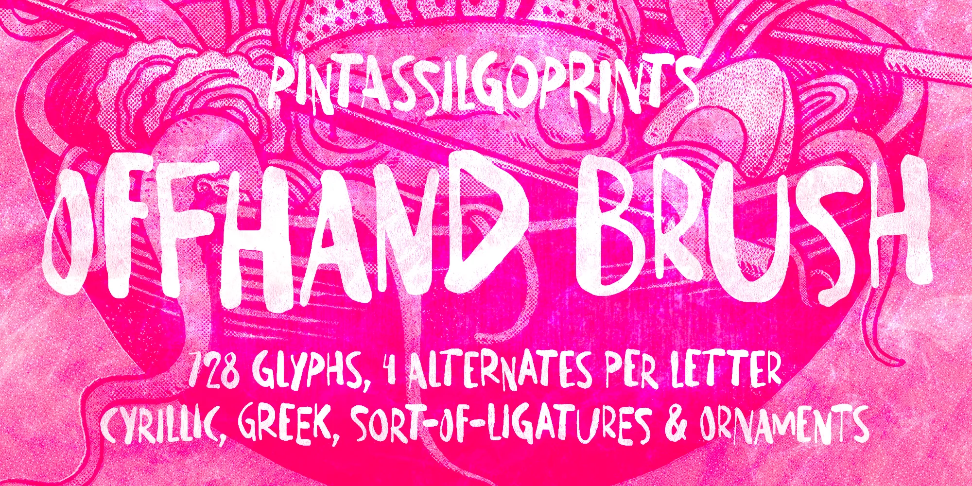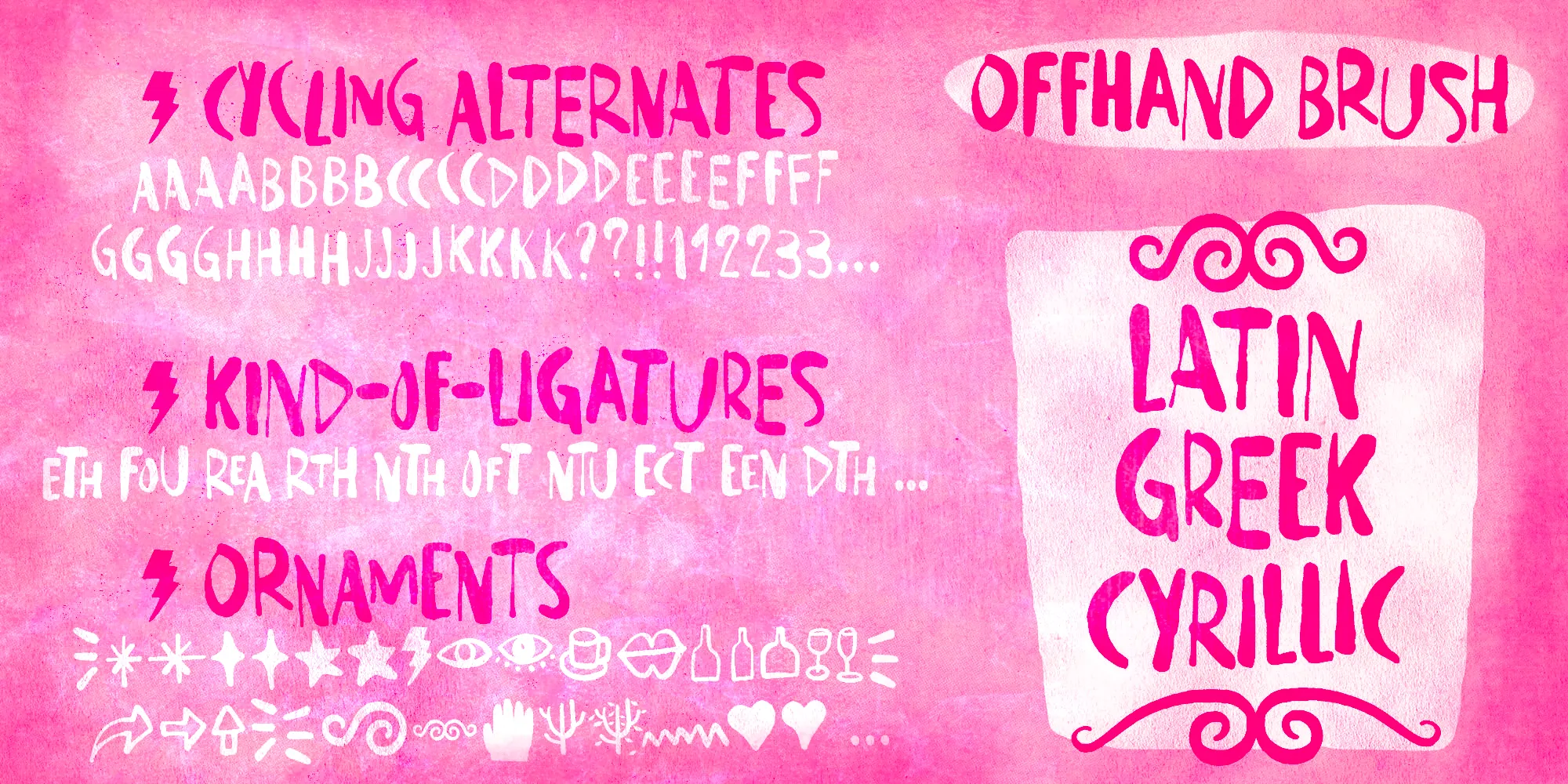 Offhand Brush is a fast, spontaneous brush font with a slightly messy feel. It’s an excellent option for book covers, packaging projects, album art, web titles, and even small chunks of text. You might see something a little messy, but it was laborious work, with four alternates for each Latin letter, two for numerals, and two options for Cyrillic and Greek letters to add liveliness and energy. Hey, wait! There are some ornaments, too. Hell yes! Use it big!