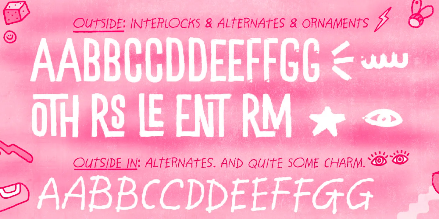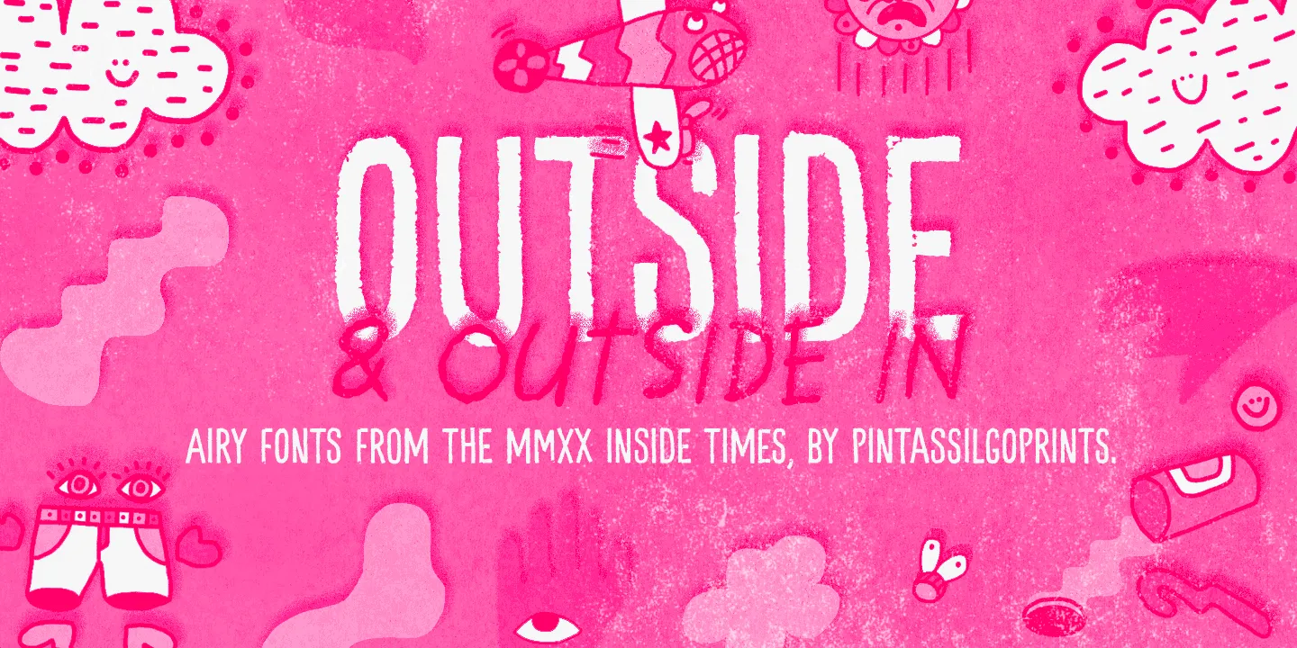 Outside is a laid-back, hand-lettered font family with two expressive styles. Outside In is a spirited script suggestive of notes scrawled in the moment, and Outside Regular, by contrast, is a tall, all-caps sans with a dry-brush texture and solid structure. Used together or separately, they offer a balanced mix of spontaneity and presence — ideal for book covers, handmade goods, packaging, posters, or any design aiming for authentic human energy. Give it a try, easy-going-ness guaranteed!