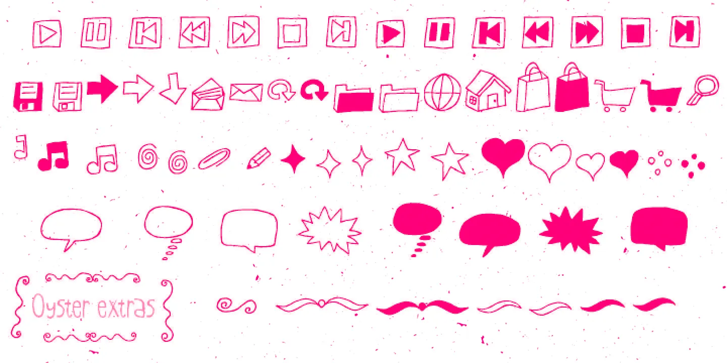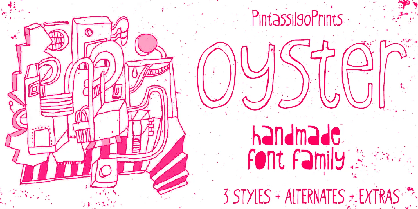 Oyster is an oddly affable, hand-drawn, slightly wonky font family. It’s a super casual and somewhat messy font that comes in two flavors — Regular and Outline — providing visual contrast, particularly if the alternates are used. While the Extras add whimsical dingbats, icons, and ornaments to complete the look. Ideal for giving a breezy, imaginative vibe to packaging, children’s books, branding, or any project seeking hand-lettered charm and light-hearted sophistication.