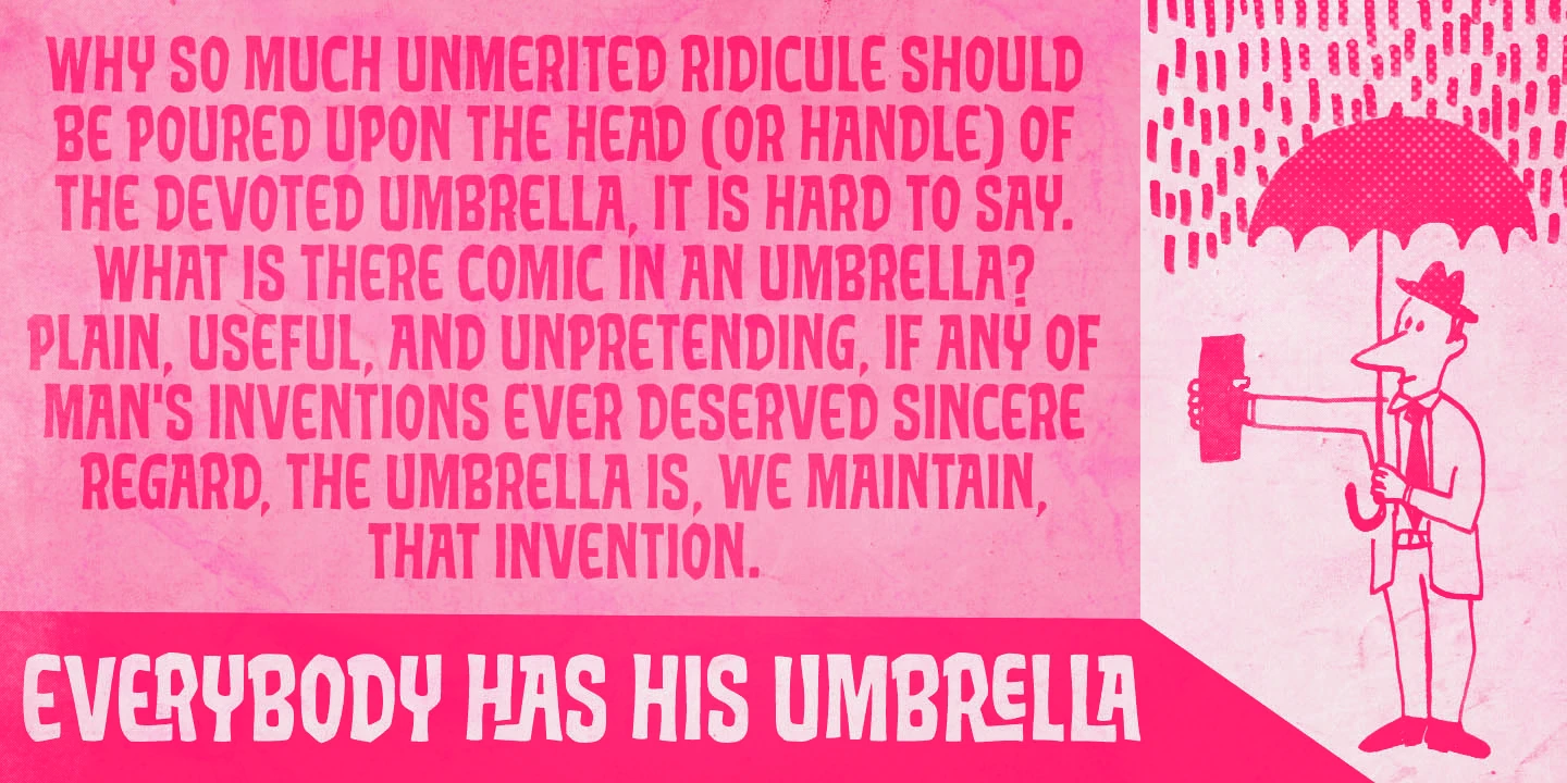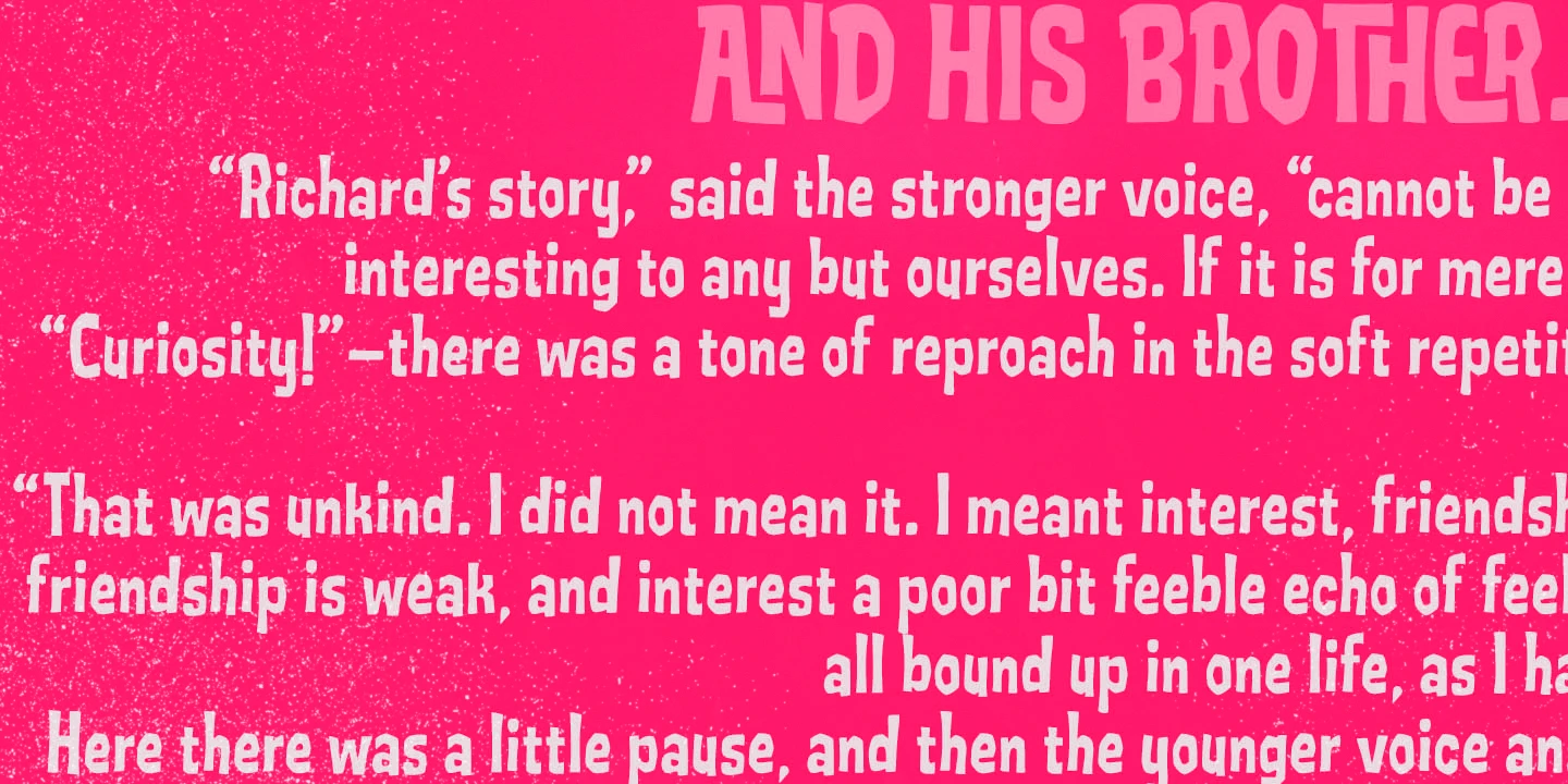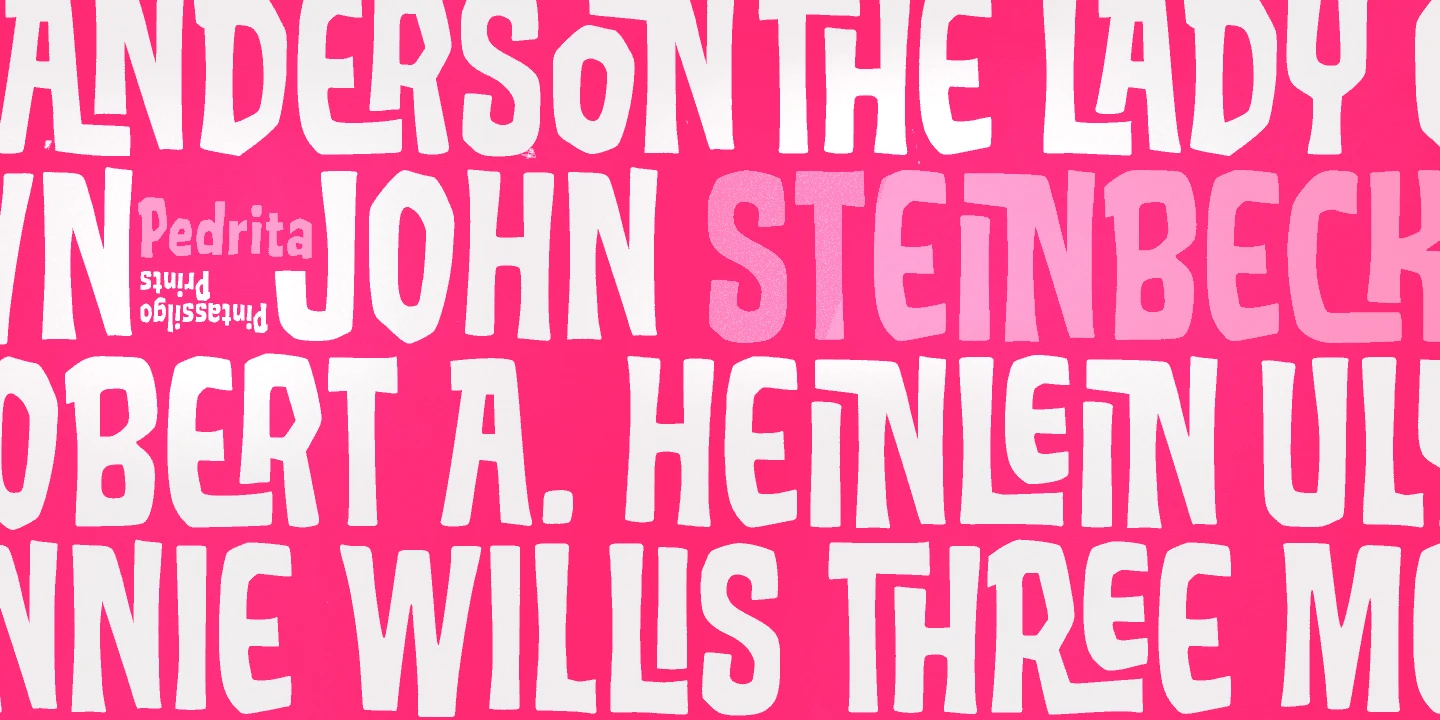 Pedrita is an unconventional condensed display font. A bit bold, somewhat showy, and entirely authentic. Sometimes, you want to go unnoticed; sometimes you don’t. The chunky forms and subtle wonkiness make these friendly letterforms playful but never unruly, designed for strong visibility! Don’t miss the handful of interlocking ligatures! Great for use in adventurous book covers, film posters, restaurant design, or anywhere character and handmade charm go hand in hand.