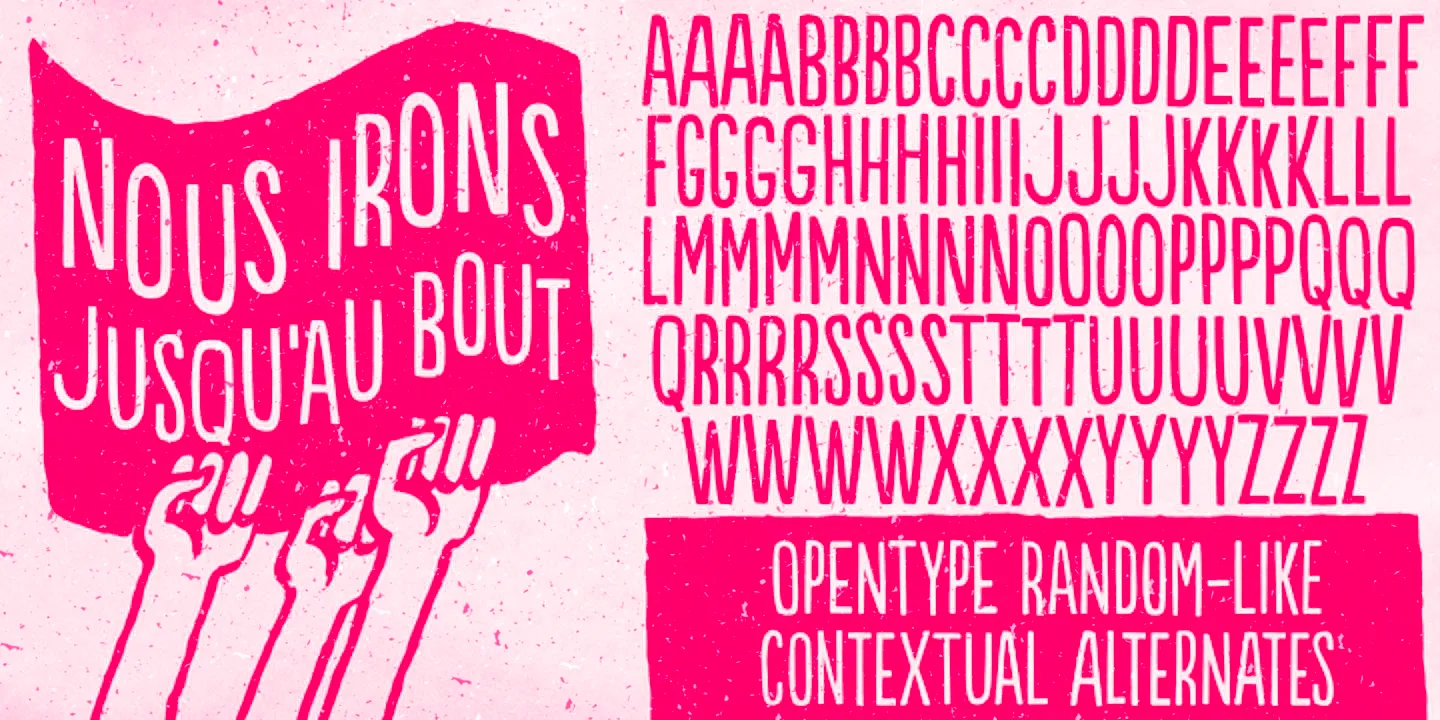 Populaire is a hand-drawn condensed sans that mimics authentic hand-lettering. Inspired by the electrifying posters from May 1968 produced by Atelier Populaire, this dynamic font is flexible enough to bring freshness and energy to a wide range of design projects. With 4 glyphs for each letter you can achieve a striking randomness making your packaging, social media, branding, advertising, and magazines come alive even more.