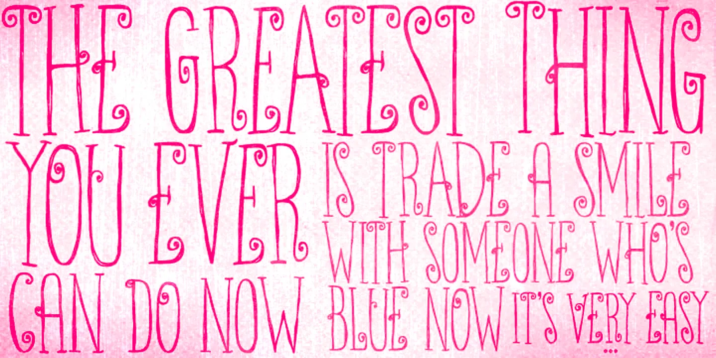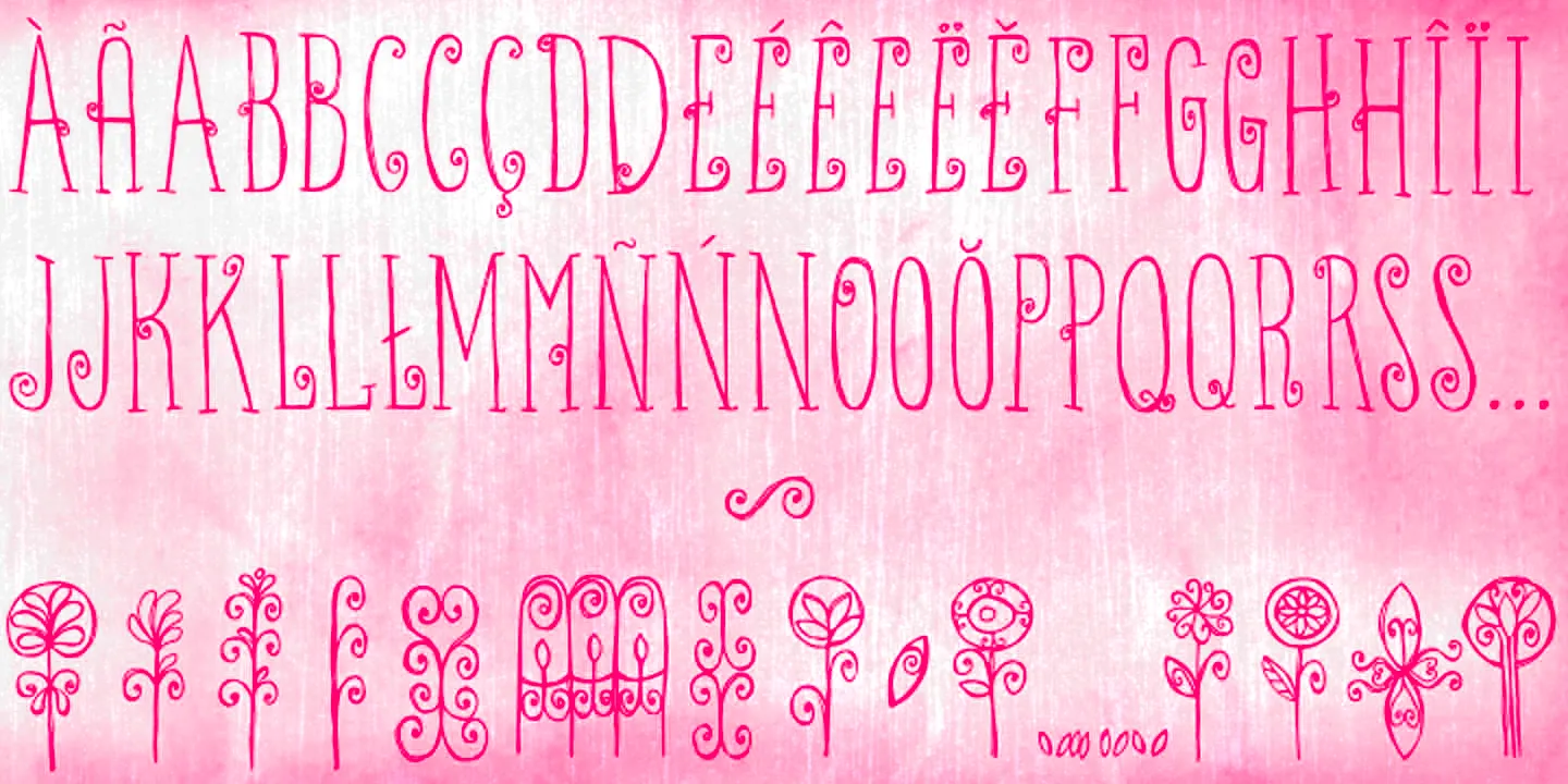 Ritornelos is a lively all-caps hand-drawn typeface. Condensed and quirky with serifs and swirls, it dances with ornate energy and lyrical detail, particularly when the alternates are used. Don’t miss the handy set of ornaments to add extra charm! Each character feels lovingly crafted — perfect for adding a touch of drama, elegance, or playful nostalgia. Whether used for book covers, boutique branding, or decorative headlines, Ritornelos turns every word into a performance.
