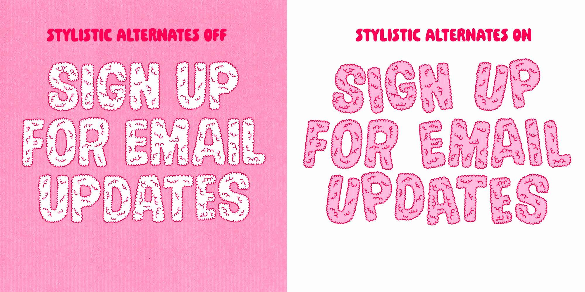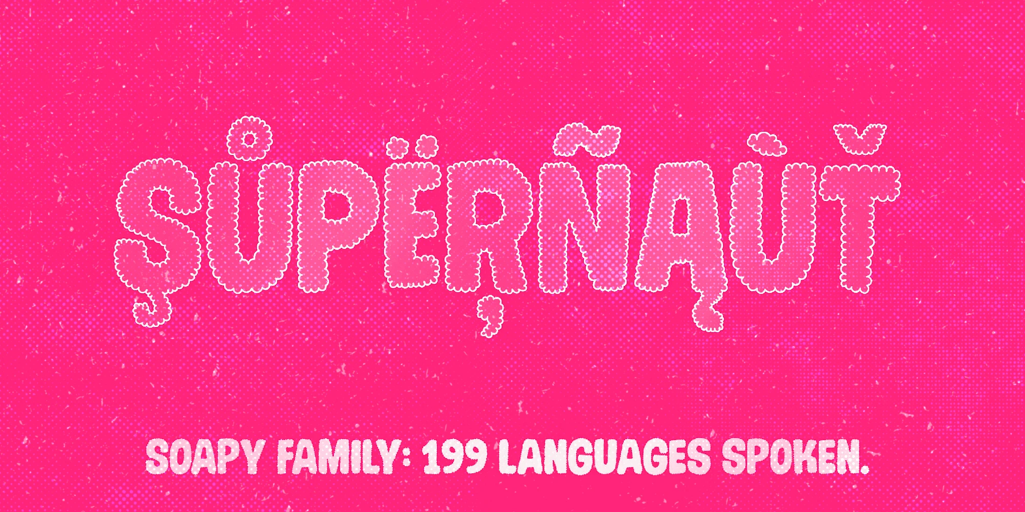 Soapy is a decorative, cartoon-like font family, naturally scented and dermatologically tested. Was it drawn with bubbles? It could also be shrubbery! With a vibrating structure, you can utilize stylistic alternates to further enhance the sensation of an animated, bouncy baseline or use different styles to create a layered look. Great for adding a cheerfully expressive personality to book covers, toy packaging, kids’ apparel, or playful signage. Put a smile in your headline! Get Soapy!
