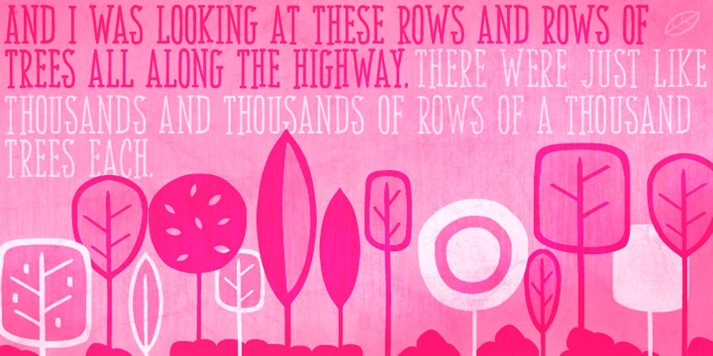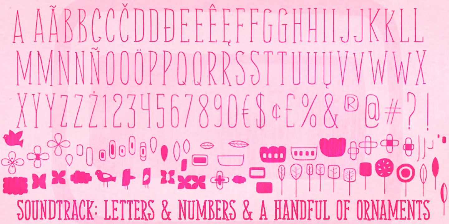 Soundtrack is a charmingly hand-lettered display slab serif with a tall, narrow structure. This monolinear, all-caps design features two alternates for each glyph, creating a natural, non-repetitive rhythm. It has two weights — plus handy dingbats in both for extra flair — and is suited for a wide range of typographic display applications, as well as for small chunks of text. Its personality is playful, making it an excellent fit for posters, book titles, branding, or packaging. Let the music sound!