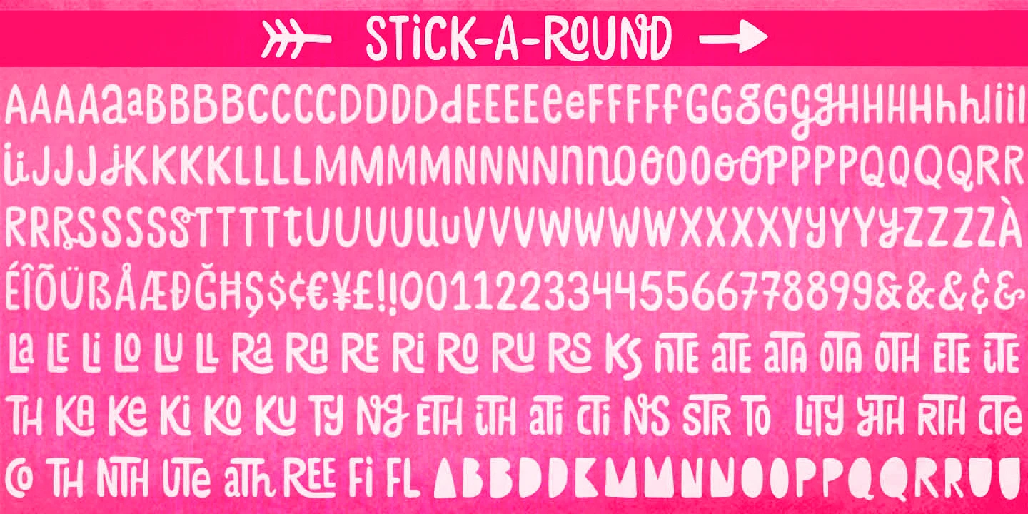 Stick-A-Round is a stylish contemporary brush-lettered typeface. It started as an attempt to domesticate our wild Daft Brush font. During the process, however, it began to take on its own shape and personality, with friendly, rounded terminals, dynamic interlock pairs, and oodles of alternates. Besides showing good humor, this font has a lovely mate loaded with handy ornaments! Stick-A-Round, have some fun, and jazz-up candy packaging, children’s books, party invitations, and board game designs.