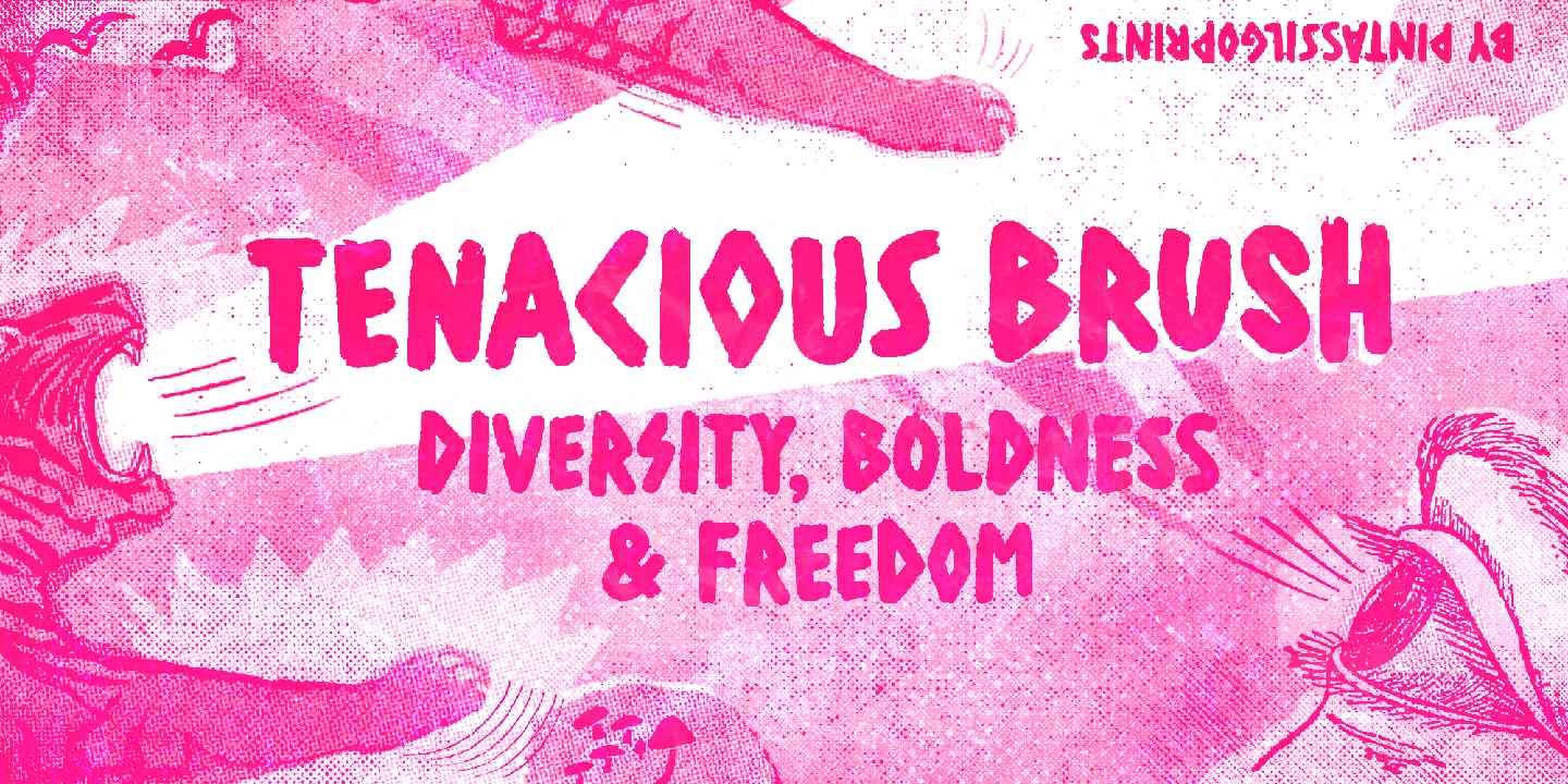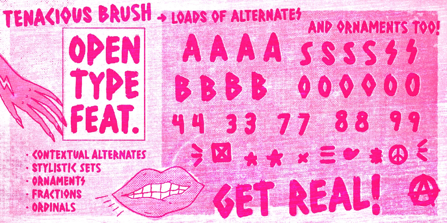 Tenacious Brush is an expressively rebellious, provocative, free-spirited, and wild-hearted typeface. It’s an all-caps face, with four alternates for each letter and two for each numeral — some letters also have stylistic choices. All of this lends itself to the desired spontaneous hand-painted feel. Tenacious Brush also features some useful ornaments to add an extra buzz here and there. Definitely a cool brush font with a modern punch, offering endless design possibilities: logos, poster art, branding, bold imagery, packaging, t-shirts, apparel, and much more!