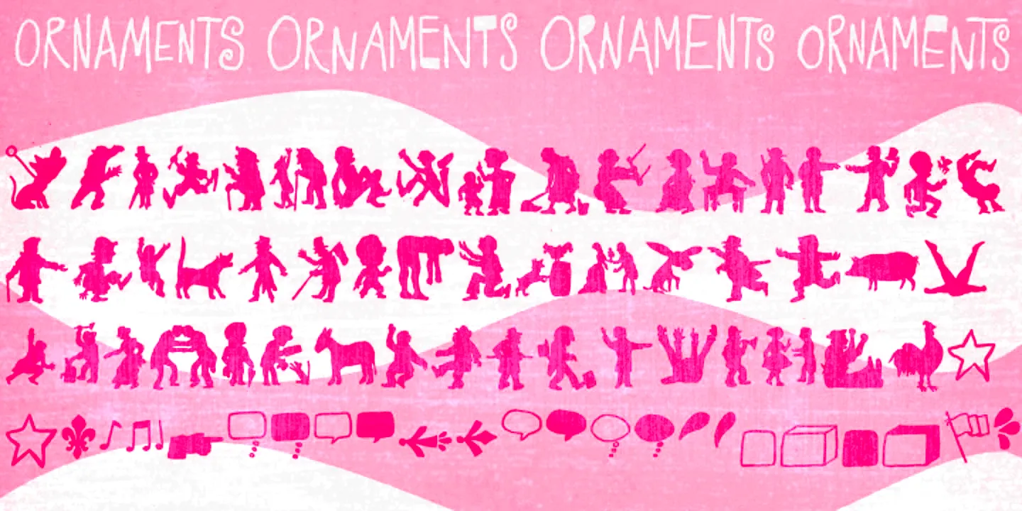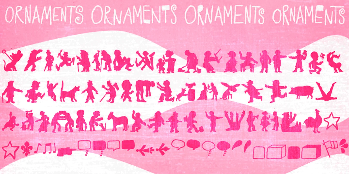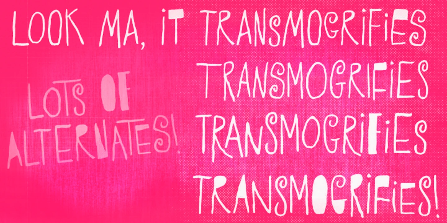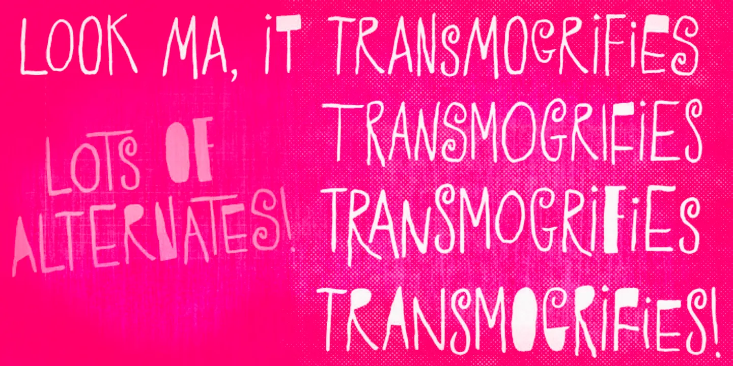 Transmogrifier is a single-style hand-lettered typeface inspired by Cuban posters by the talented and prolific graphic artist Eduardo Muñoz Bachs. It is filled with urgency and dynamism because it was hand-painted with a thin brush, using loose, fast strokes. The font is packed with plenty of alternates that will help create the illusion of original hand-lettered designs. The font also has a set of rough pictures based on charcoal sketches from the Shniedewend & Lee Company in 1888. These were handpainted with the same thin brush as the letters, making them a natural complement.